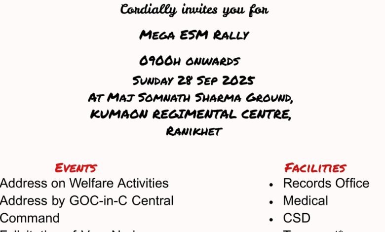 कुमाऊं रेजीमेंटल सेंटर, रानीखेत द्वारा मुख्यालय सेंट्रल कमांड के तत्वावधान में एक भव्य पूर्व सैनिक संपर्क रैली का आयोजन 28 सितम्बर 2025 (रविवार) को किया जा रहा है। यह रैली सोमनाथ ग्राउंड, रानीखेत में प्रातः 9:00 बजे से आरंभ होगी।