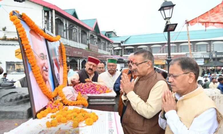 मसूरी के गांधी चौक में राष्ट्रपिता महात्मा गांधी व पूर्व प्रधानमंत्री लाल बहादुर शास्त्री को पुष्पांजलि अर्पित करते कैबिनेट मंत्री गणेश जोशी